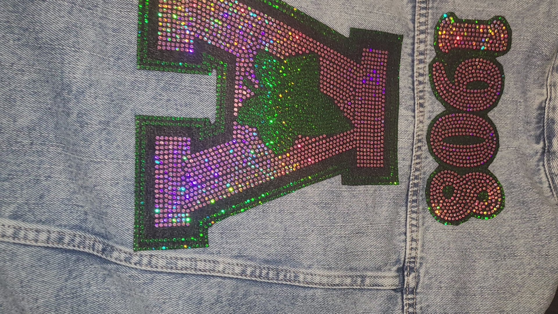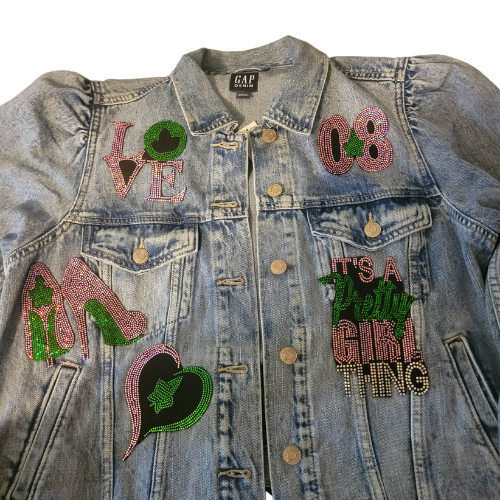 This stylish GAP denim jacket features exclusive Ivy Girl-themed embellishments with sparkling spangle patches. Please note, these patches are crafted with spangles and are not rhinestones. Perfect for demonstrating your sorority pride, this non-licensed design is a fashionable addition to any wardrobe.